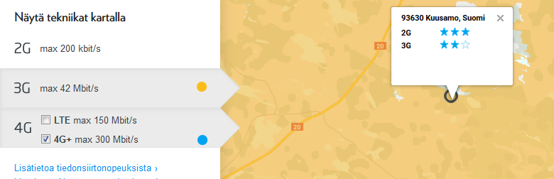 Toinen seikka johon kannattaa kiinnittää huomiota, on että meneekö tukiasemalle kuitu. Jos päätien varressa on n. kilometrin välein harmaita putkia, joissa on keltainen lätkä ja siinä punainen heijastin ja sen lisäksi muutaman kilometrin välein ruskeita "pönttöjä", niin silloin ainakin tien varressa kulkee kuitu. Toinen vaihtoehto on, että linkkiyhteys on toteutettu ilmateitse ja silloin ainakin itse pelkään että kaistaa voi olla niukasti.
