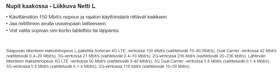 Esimerkiksi Sonera myy Posiolle 4G-liittymäänsä 150 Mbit/s nopeuksilla, vaikka ehdoton käytännön maksimikin on vain 80 Mbit/s, eli se todellinen vaihteluväli joka on pienellä präntätty sinne alle.